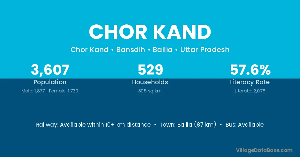 Ballia (87 km) is the nearest town to Chor Kand village for major economic activities and is located approximately 87 km away.