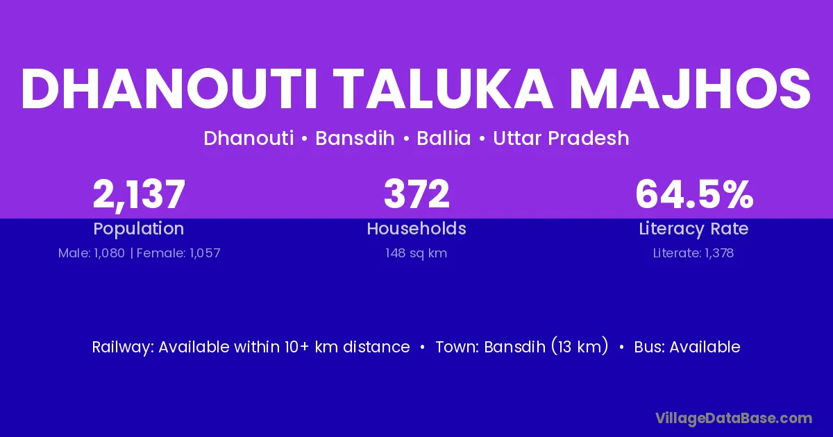 Bansdih (13 km) is the nearest town to Dhanouti Taluka Majhos village for major economic activities and is located approximately 13 km away.