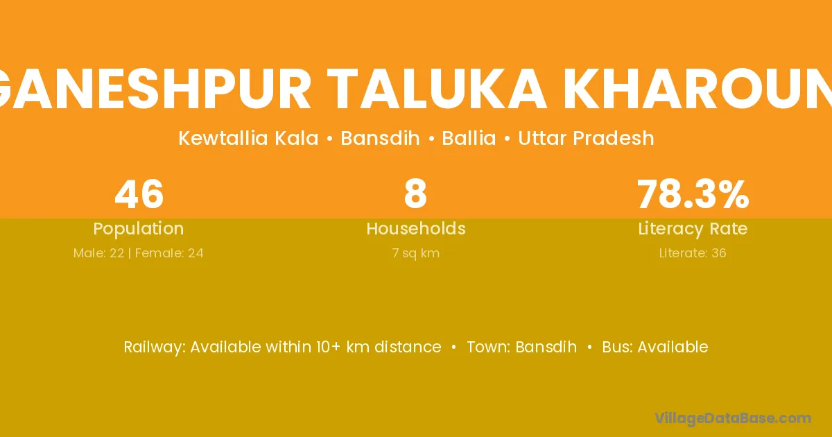 Ganeshpur Taluka Kharouni village has a total population of 46 people, of which 22 are males and 24 are females.