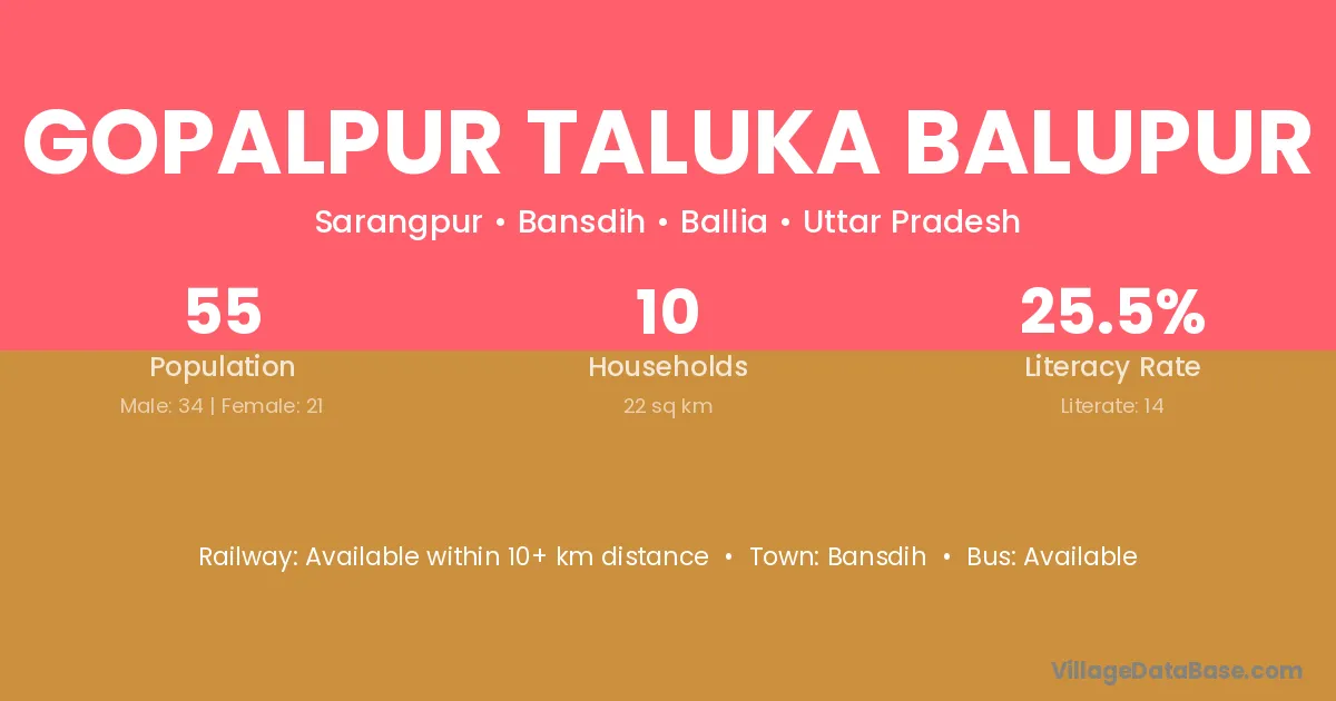 Gopalpur Taluka Balupur village has a total population of 55 people, of which 34 are males and 21 are females.