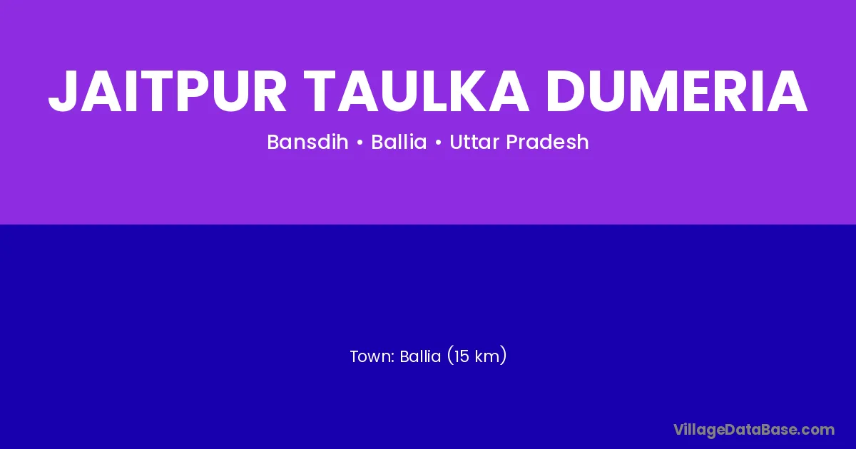 Ballia (15 km) is the nearest town to Jaitpur Taulka Dumeria village for major economic activities and is located approximately 15 km away.