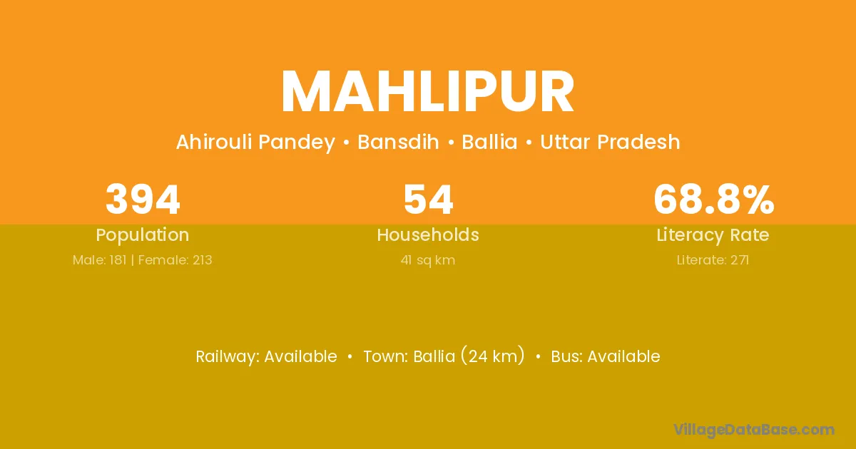 Ballia (24 km) is the nearest town to Mahlipur village for major economic activities and is located approximately 24 km away.