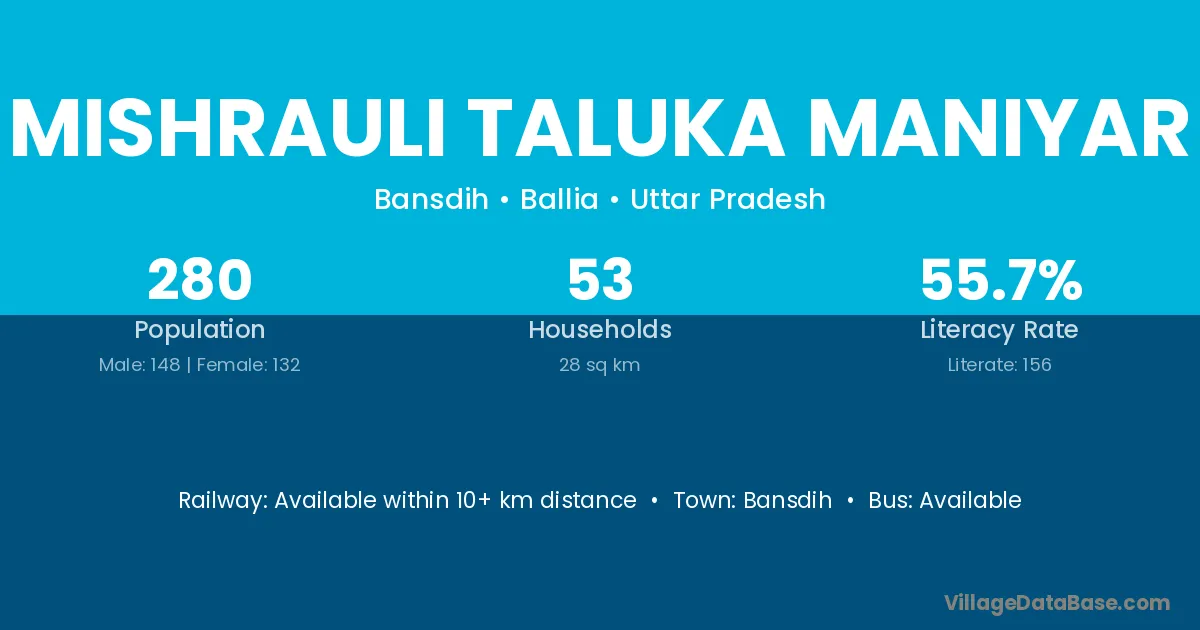 Mishrauli Taluka Maniyar village has a total population of 280 people, of which 148 are males and 132 are females.