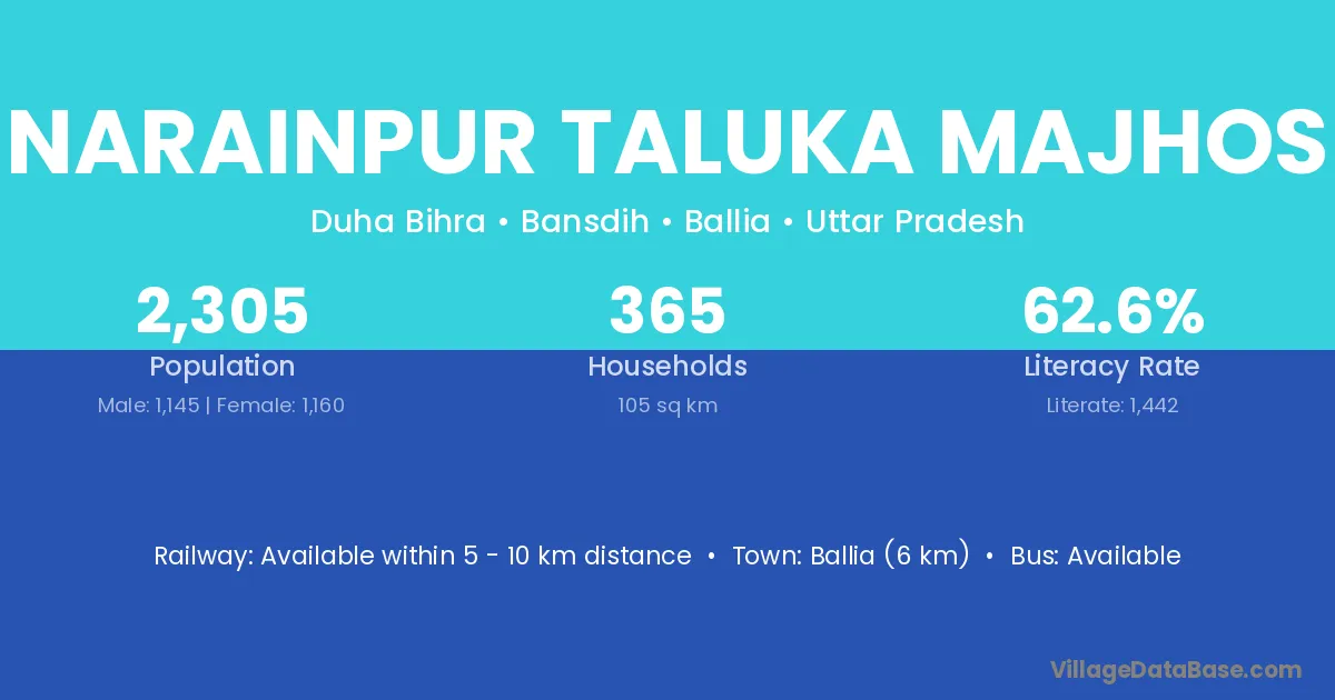 Ballia (6 km) is the nearest town to Narainpur Taluka Majhos village for major economic activities and is located approximately 6 km away.