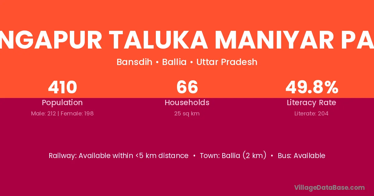 Ballia (2 km) is the nearest town to Sangapur Taluka Maniyar Patti village for major economic activities and is located approximately 2 km away.