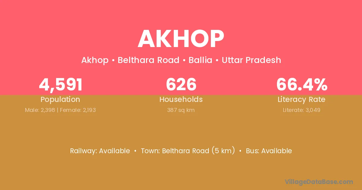 Belthara Road (5 km) is the nearest town to Akhop village for major economic activities and is located approximately 5 km away.