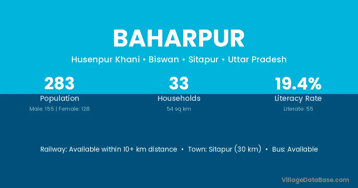 The literacy rate of Baharpur village is 58.41%. Male literacy stands at 68.70% and female literacy at 49.12%.
