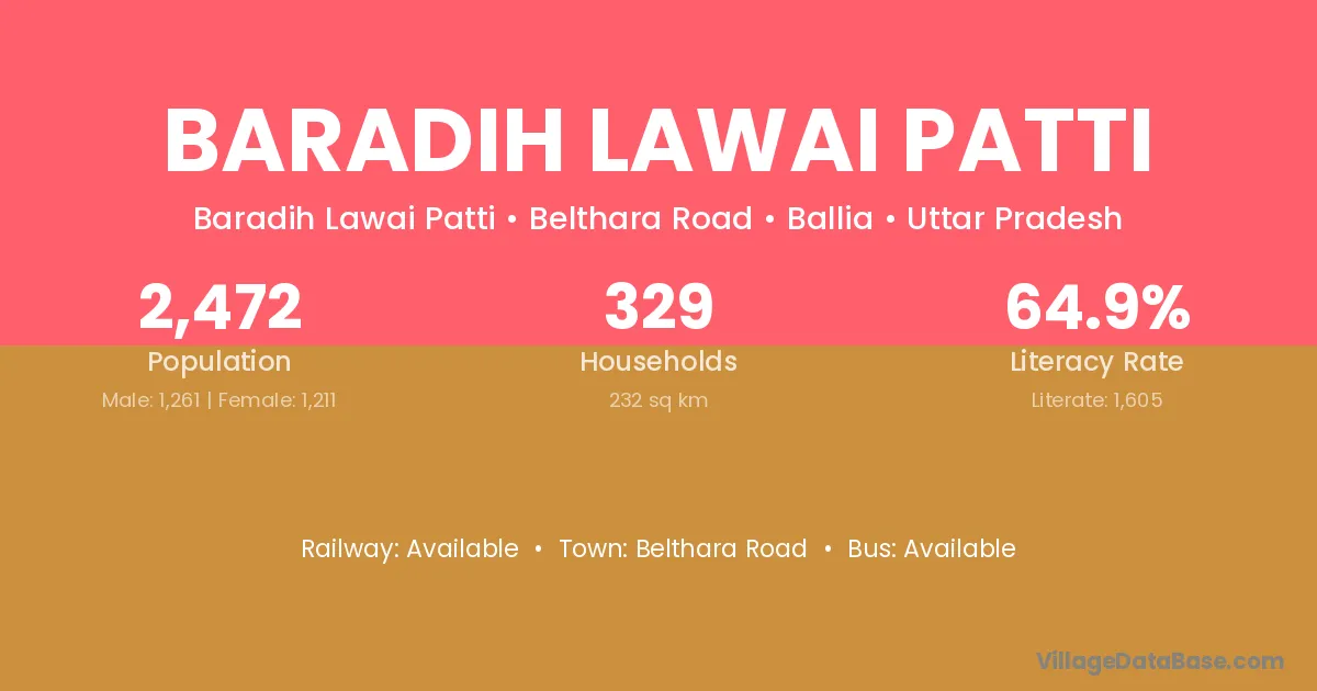 Baradih Lawai Patti village has a total population of 2,472 people, of which 1,261 are males and 1,211 are females.