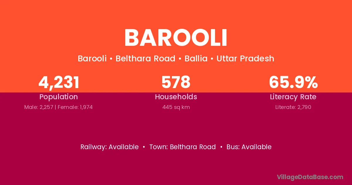 Barooli village is located in the Belthara Road Tehsil of the Ballia district in Uttar Pradesh .