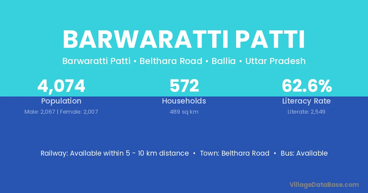 Barwaratti Patti village has a total population of 4,074 people, of which 2,067 are males and 2,007 are females.