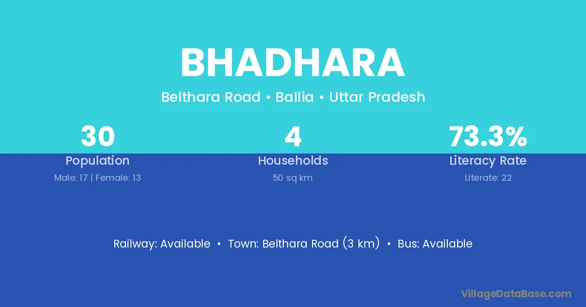 Belthara Road (3 km) is the nearest town to Bhadhara village for major economic activities and is located approximately 3 km away.