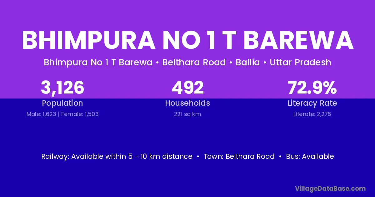 Bhimpura No 1 T Barewa village has a total population of 3,126 people, of which 1,623 are males and 1,503 are females.