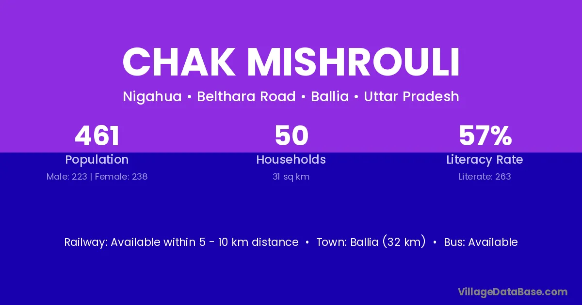 Ballia (32 km) is the nearest town to Chak Mishrouli village for major economic activities and is located approximately 32 km away.