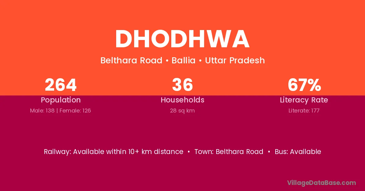 Dhodhwa village has a total population of 264 people, of which 138 are males and 126 are females.