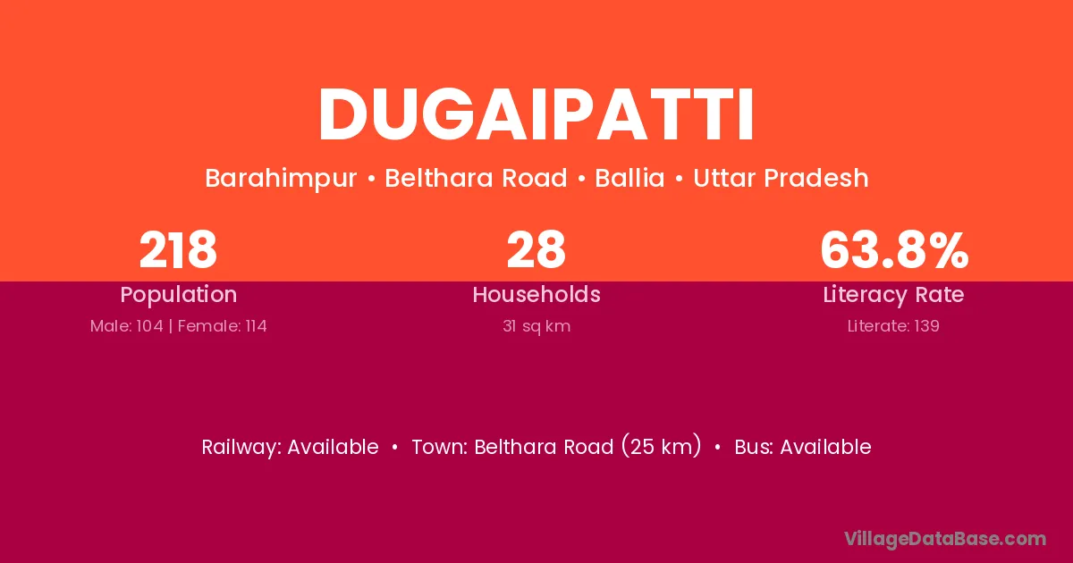 Dugaipatti village has a total population of 218 people, of which 104 are males and 114 are females.