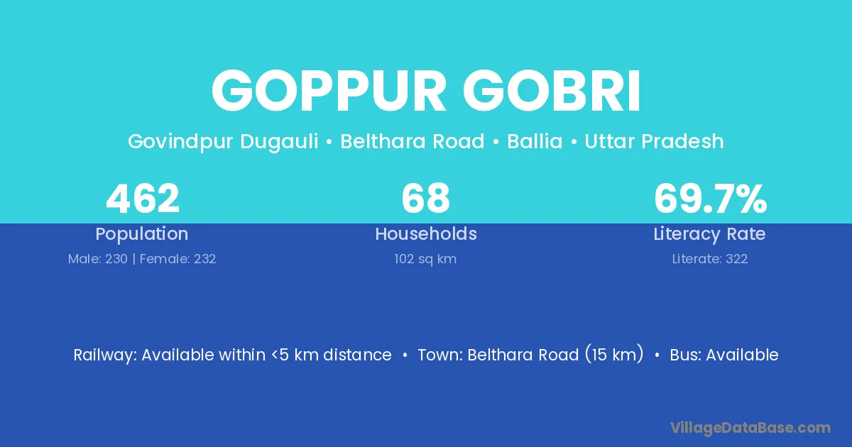 Goppur Gobri village has a total population of 462 people, of which 230 are males and 232 are females.