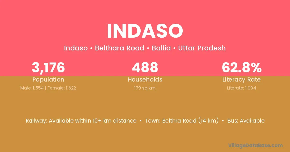 Belthra Road (14 km) is the nearest town to Indaso village for major economic activities and is located approximately 14 km away.