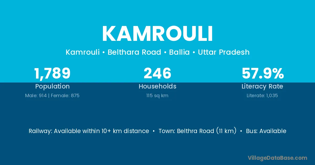 Belthra Road (11 km) is the nearest town to Kamrouli village for major economic activities and is located approximately 11 km away.