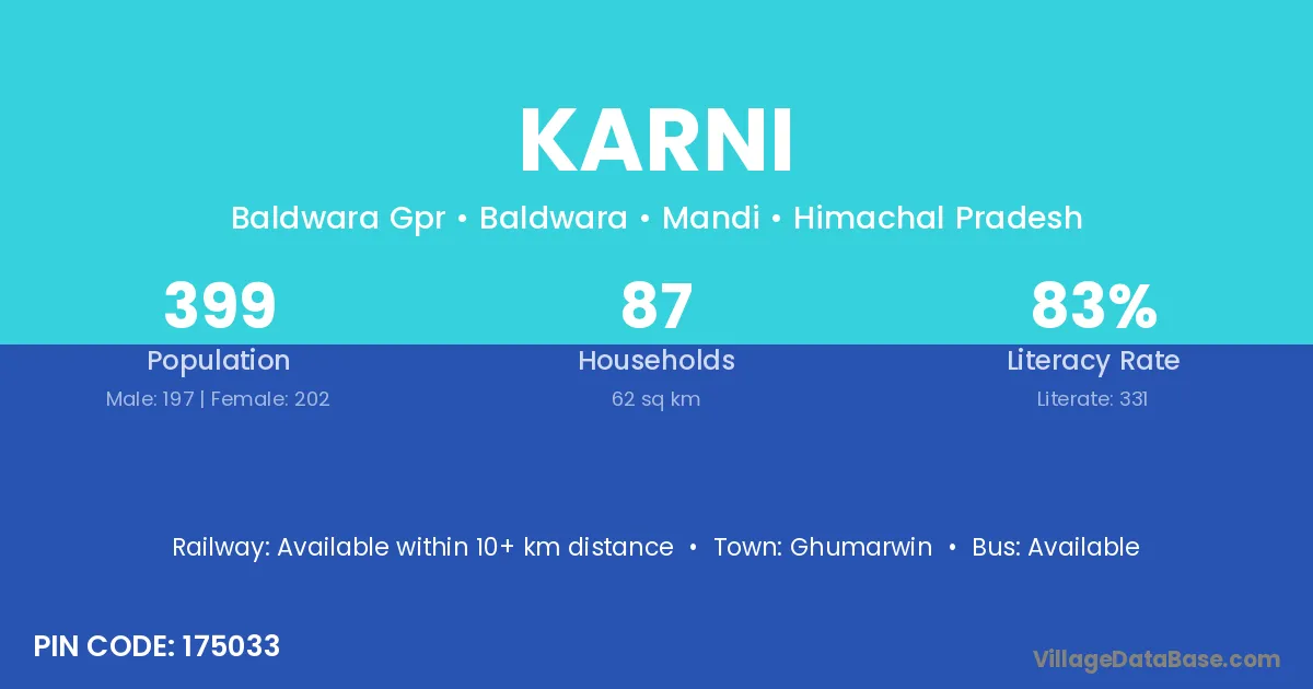 The literacy rate of Karni village is 62.86%. Male literacy stands at 72.63% and female literacy at 52.10%.