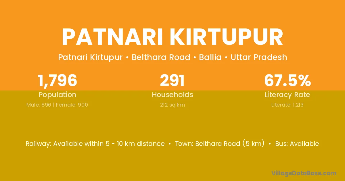 Belthara Road (5 km) is the nearest town to Patnari Kirtupur village for major economic activities and is located approximately 5 km away.