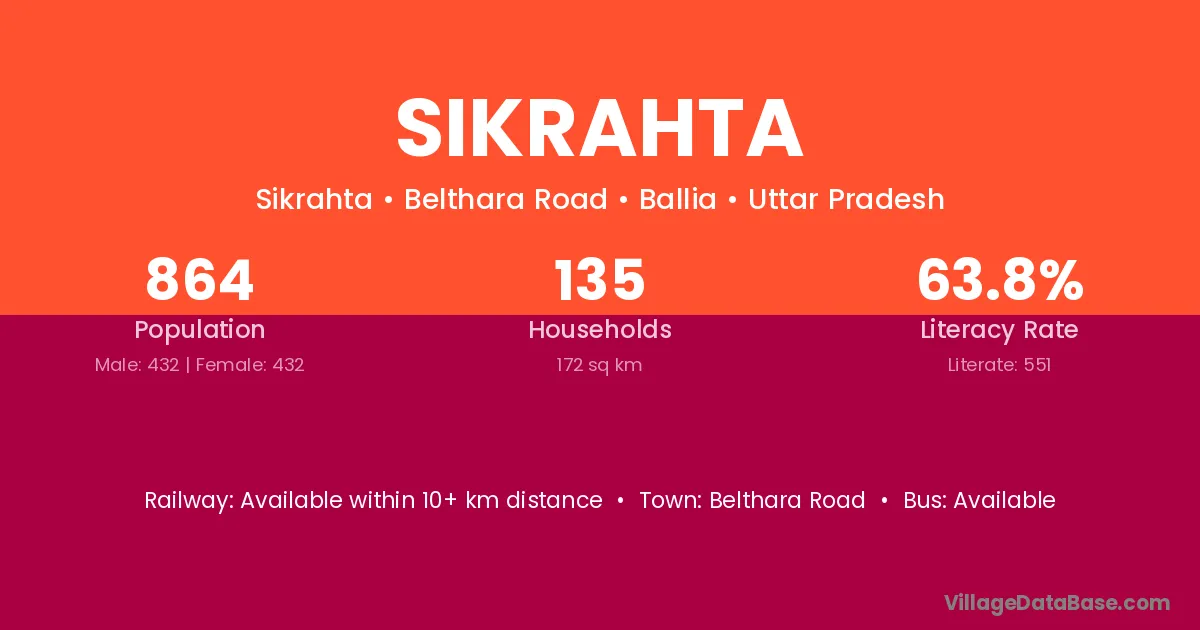 Sikrahta village has a total population of 864 people, of which 432 are males and 432 are females.