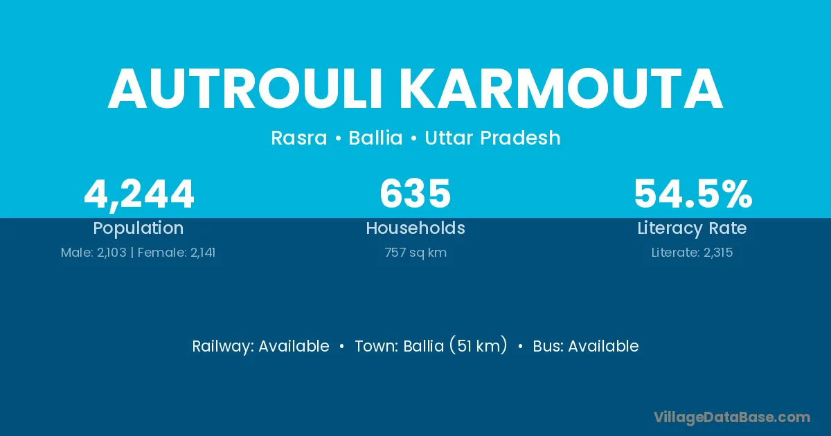 Ballia (51 km) is the nearest town to Autrouli Karmouta village for major economic activities and is located approximately 51 km away.