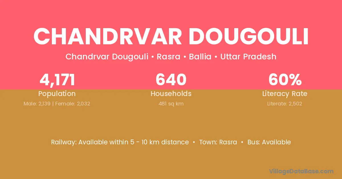 Chandrvar Dougouli village has a total population of 4,171 people, of which 2,139 are males and 2,032 are females.