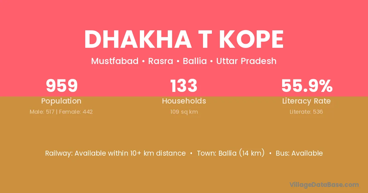 Ballia (14 km) is the nearest town to Dhakha T Kope village for major economic activities and is located approximately 14 km away.