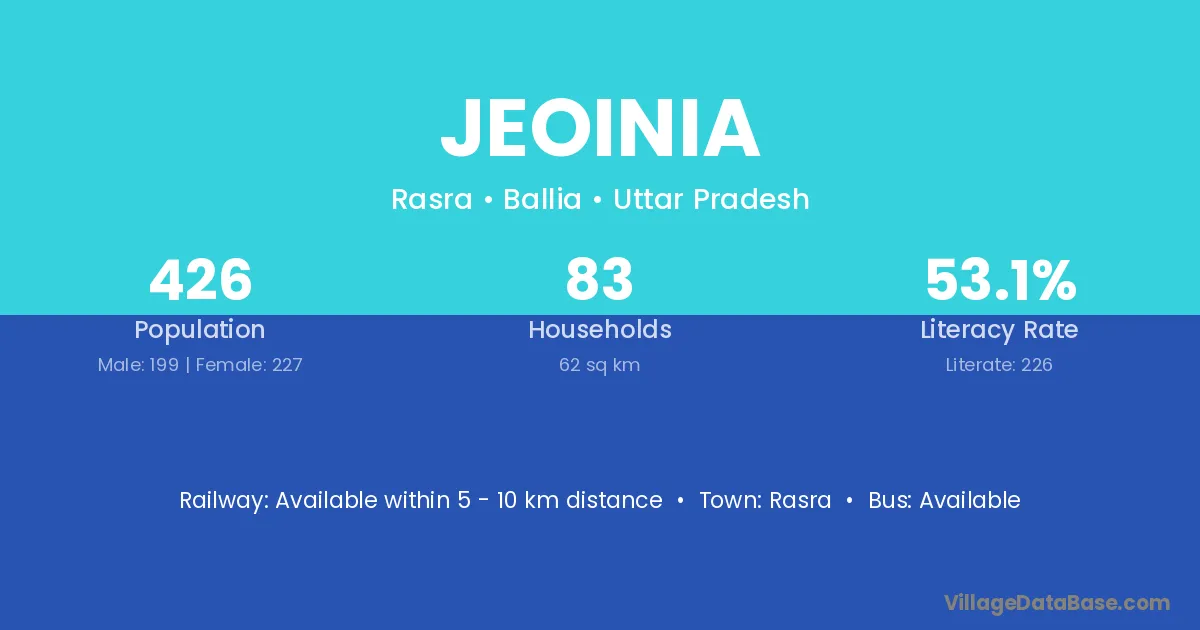 The literacy rate of Jeoinia village is 53.05%. Male literacy stands at 62.81% and female literacy at 44.49%.