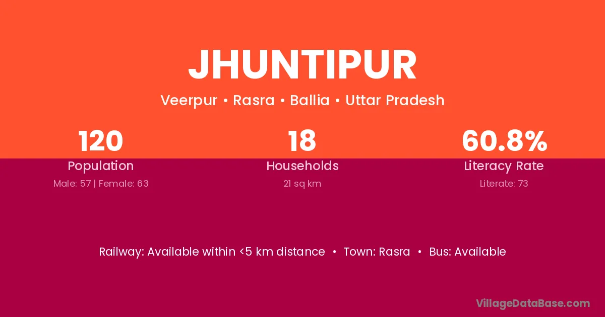 Jhuntipur village has a total population of 120 people, of which 57 are males and 63 are females.