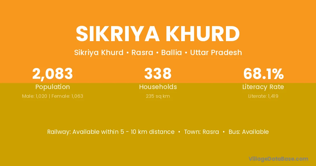 Sikriya Khurd village has a total population of 2,083 people, of which 1,020 are males and 1,063 are females.