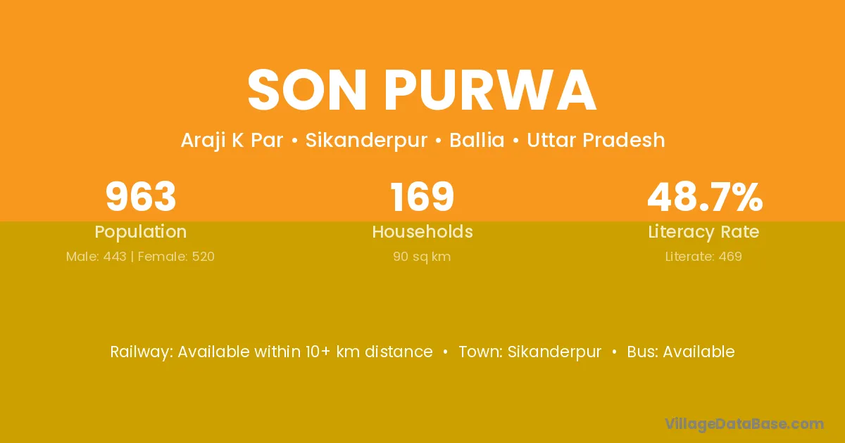 The literacy rate of Son Purwa village is 67.13%. Male literacy stands at 80.28% and female literacy at 54.17%.