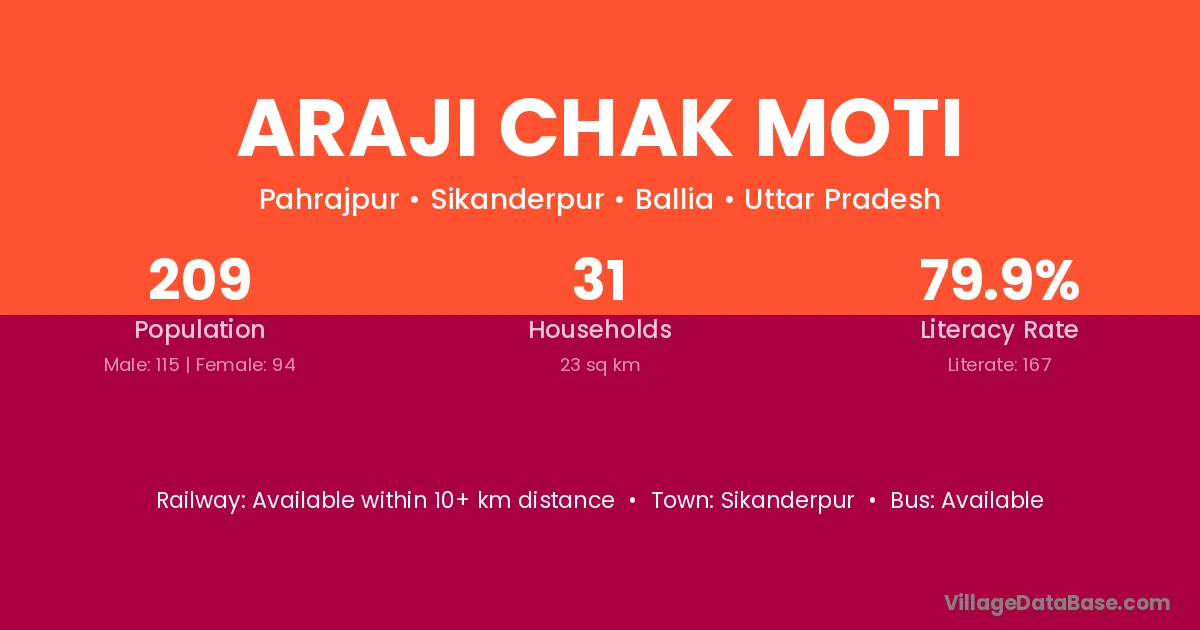 Araji Chak Moti village has a total population of 209 people, of which 115 are males and 94 are females.