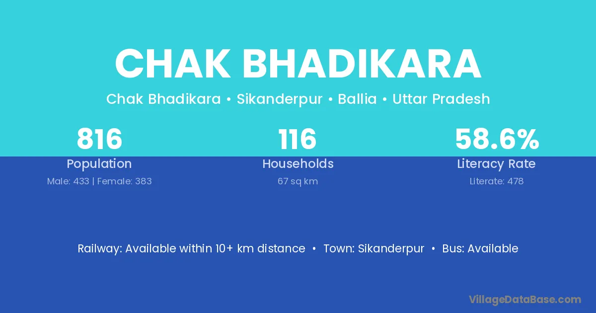 Chak Bhadikara village has a total population of 816 people, of which 433 are males and 383 are females.
