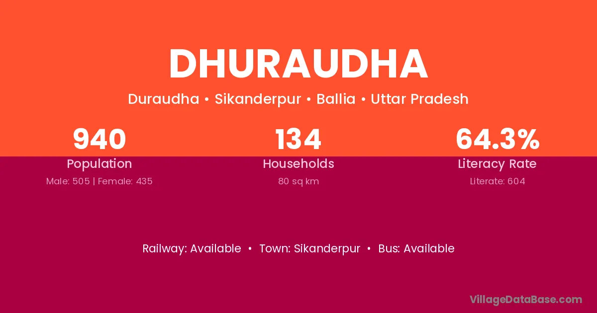 Dhuraudha village has a total population of 940 people, of which 505 are males and 435 are females.
