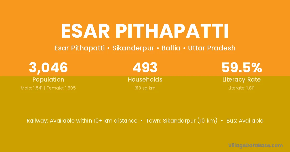 Sikandarpur (10 km) is the nearest town to Esar Pithapatti village for major economic activities and is located approximately 10 km away.