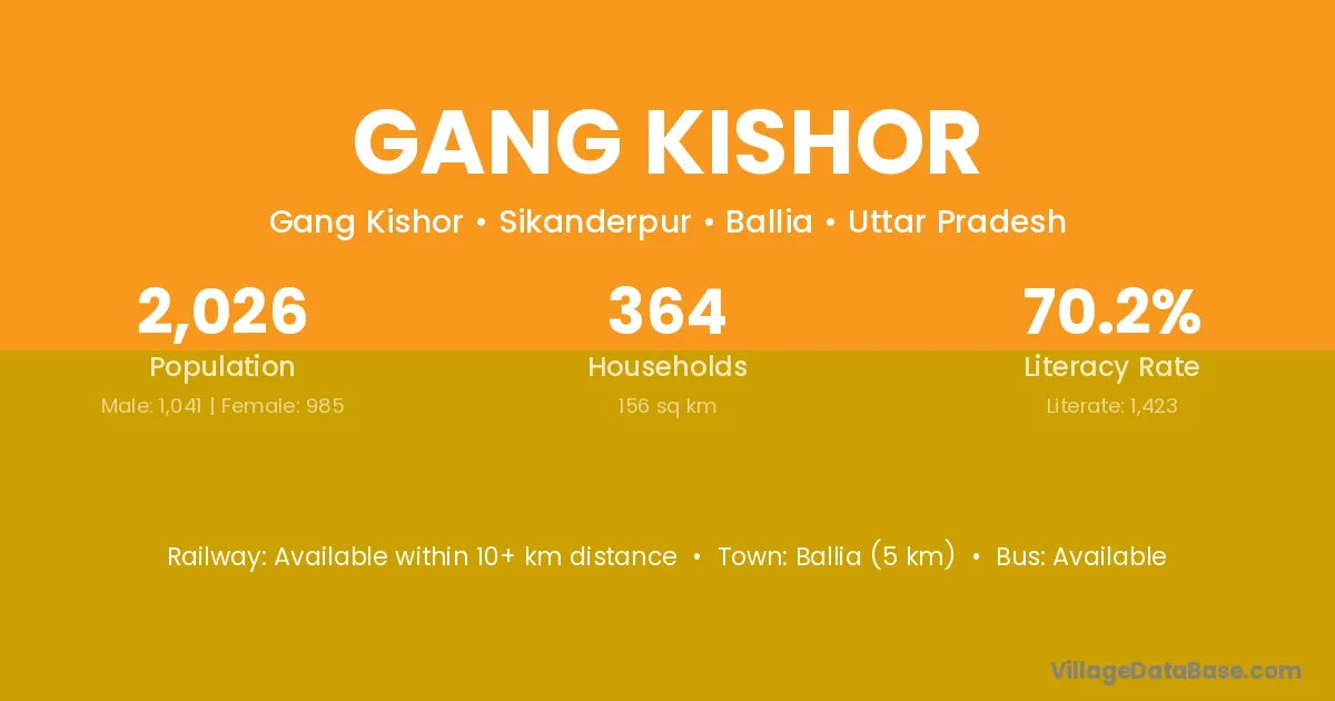 Ballia (5 km) is the nearest town to Gang Kishor village for major economic activities and is located approximately 5 km away.