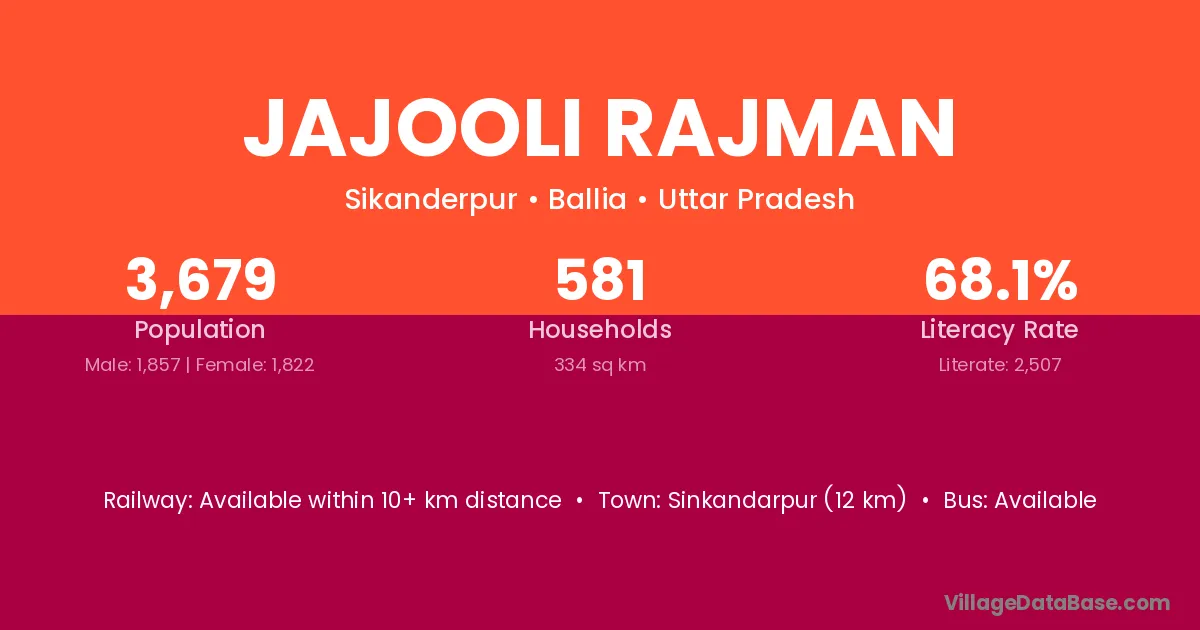 Jajooli Rajman village has a total population of 3,679 people, of which 1,857 are males and 1,822 are females.