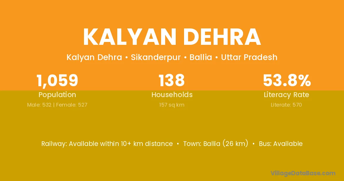 Ballia (26 km) is the nearest town to Kalyan Dehra village for major economic activities and is located approximately 26 km away.