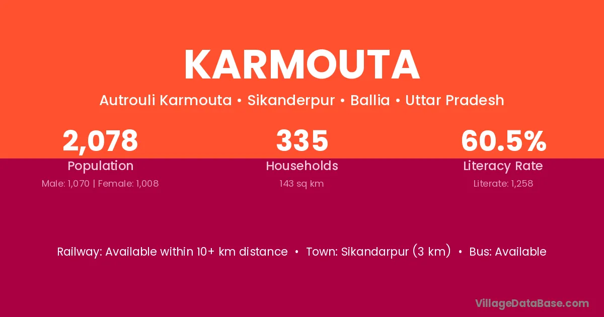 Sikandarpur (3 km) is the nearest town to Karmouta village for major economic activities and is located approximately 3 km away.
