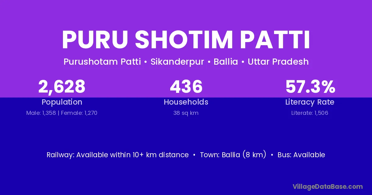 Ballia (8 km) is the nearest town to Puru Shotim Patti village for major economic activities and is located approximately 8 km away.