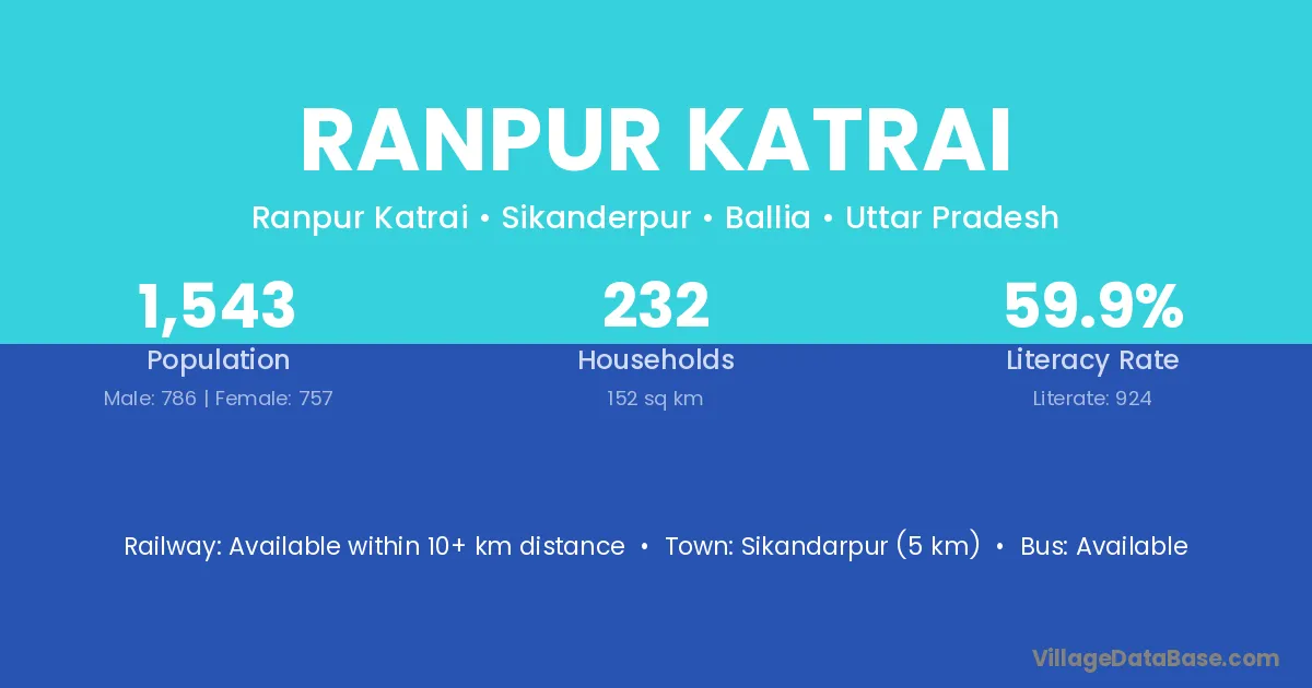 Sikandarpur (5 km) is the nearest town to Ranpur Katrai village for major economic activities and is located approximately 5 km away.
