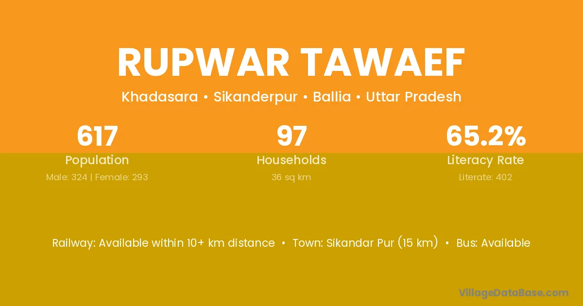 Sikandar Pur (15 km) is the nearest town to Rupwar Tawaef village for major economic activities and is located approximately 15 km away.