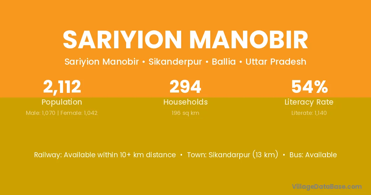 Sikandarpur (13 km) is the nearest town to Sariyion Manobir village for major economic activities and is located approximately 13 km away.