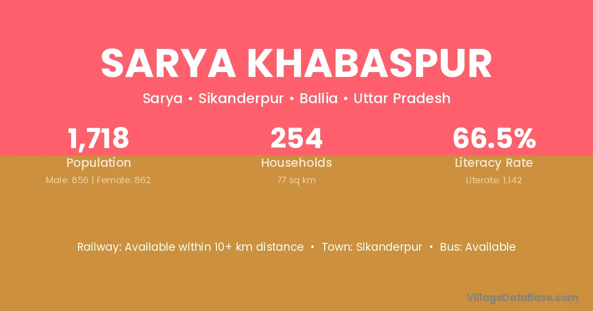 Sarya Khabaspur village has a total population of 1,718 people, of which 856 are males and 862 are females.