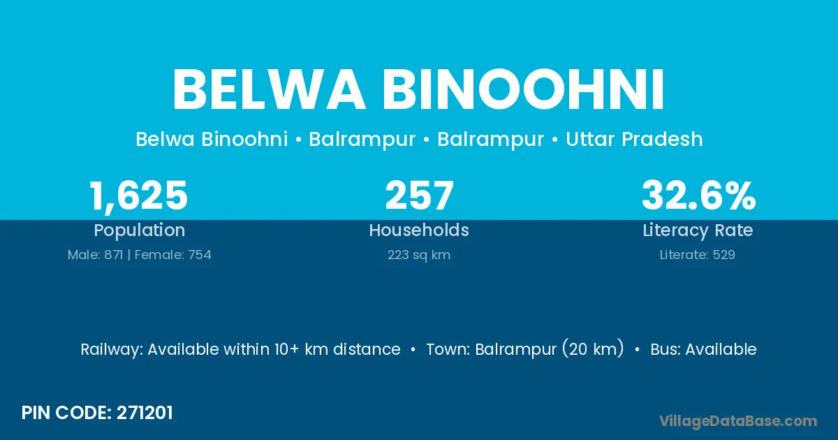 Balrampur (20 km) is the nearest town to Belwa Binoohni village for major economic activities and is located approximately 20 km away.