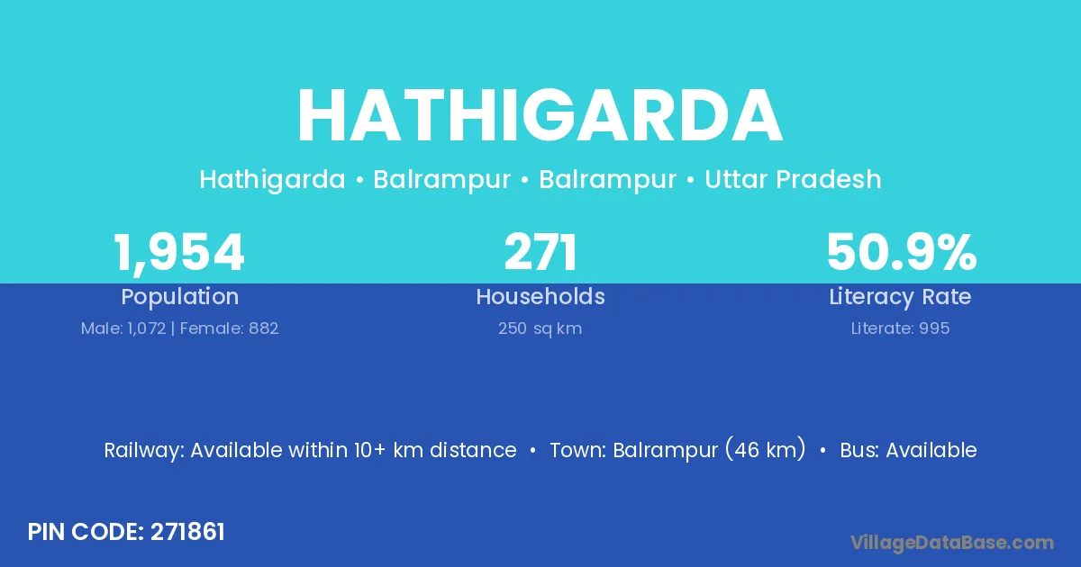Balrampur (46 km) is the nearest town to Hathigarda village for major economic activities and is located approximately 46 km away.