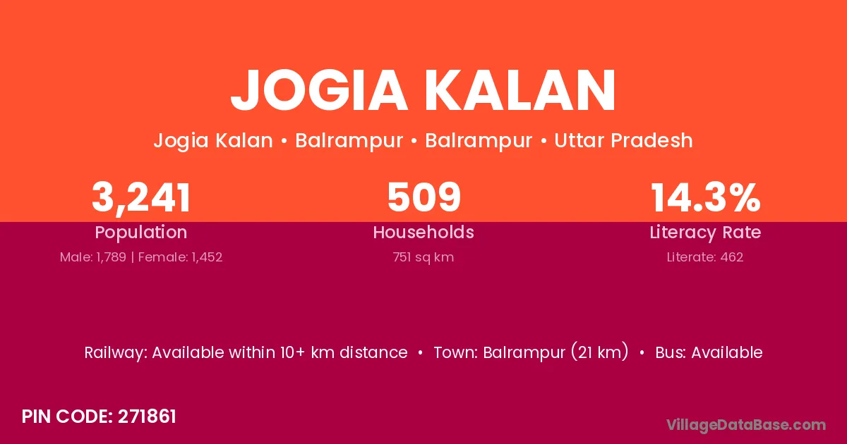 Balrampur (21 km) is the nearest town to Jogia Kalan village for major economic activities and is located approximately 21 km away.