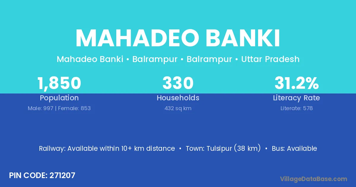 Tulsipur (38 km) is the nearest town to Mahadeo Banki village for major economic activities and is located approximately 38 km away.