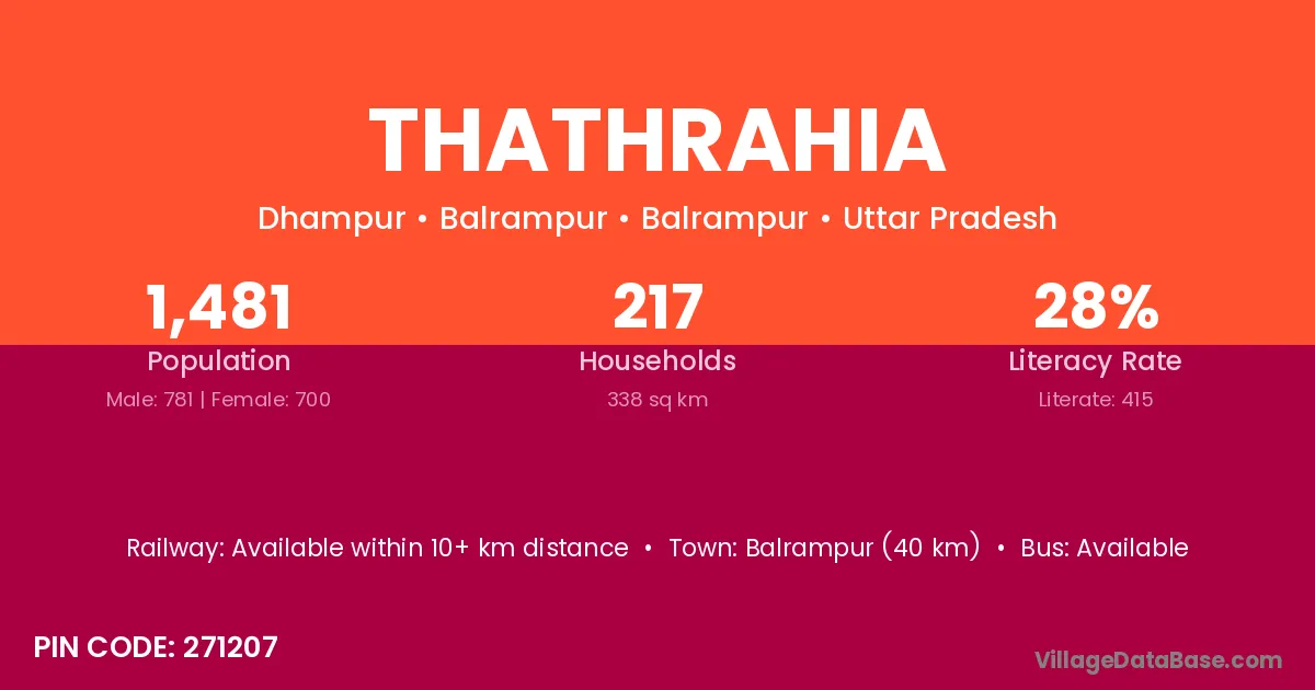 Balrampur (40 km) is the nearest town to Thathrahia village for major economic activities and is located approximately 40 km away.